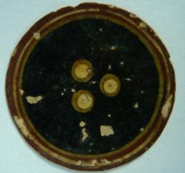 | Description / विवरण | Circular flat ganjifa playing cards depicting three circular balls on black background. The other side is plain. |