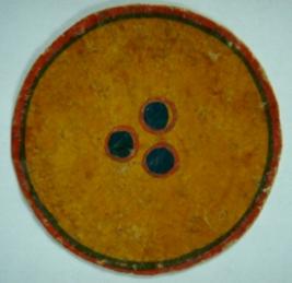 | Description / विवरण | Circular flat ganjifa depicting three circles on yellow background on one side and other side is plain. |