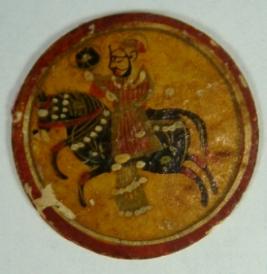 | Description / विवरण | Flat circular ganjifa playing card depicting a horse with rider on one side and other side is plain. |