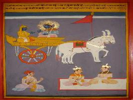 | Description / विवरण | Miniature painting based on Shri Bhagwat Gita. Arjun and Krishna describe Arjun that king is the master of earth and he should be Purushutam a man. While three kings are depicted in the lower side. |