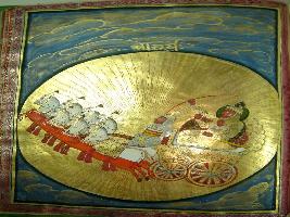 | Description / विवरण | Miniature painting depicting four armed Surya on his chariot while the son is seen in a circular size where god Surya is seen. |