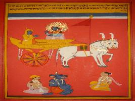 | Description / विवरण | Miniature painting based on Shri Bhagwat Gita. Arjun and Krishna where Krishna says that the internal things are not known by demon or Devtas also while in the lower part depict a demon, a Brahman and a noble. |