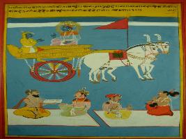 | Description / विवरण | Miniature painting based on Shri Bhagwat Gita. It depicts Arjun asking Krishna about Narad and how he has become supreme among all sages. |