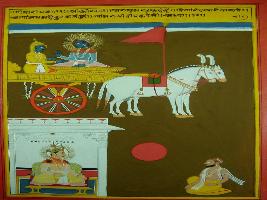 | Description / विवरण | Miniature painting based on Shri Bhagwat Gita. It depicts Krishna preaching Arjun that he help my followers to get rid of sorrow his pain and foolishness he provide them light of knowledge. |
