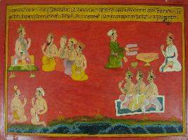 | Description / विवरण | Miniature painting based on Mahabharat - Vana parva depicting Yudhisthir is telling people about the status of people on the basis of their livelihood and eating style. |