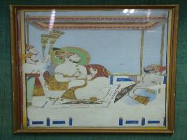 | Description / विवरण | It s a miniature painting of Court scene. Raja is wearing a white and golden colour tunic and red turban. Two attendant with green and golden colour chauri are standing at back side of Raja. White foreground and light blue back ground. |