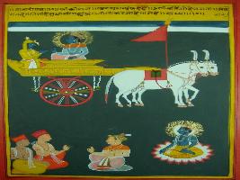 | Description / विवरण | Miniature painting based on Shri Bhagwat Gita. It depicts Krishna preaching Arjun that one who take his name and prays for him bestow them with intelligence and yoga. They will get him in due course of time. |