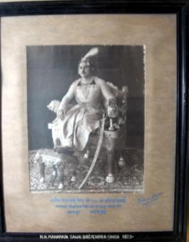 | Description / विवरण | Black and white photograph of full length portrait of H. H. Maharaja Sawai Brijendra Singh. It is framed in glass. |