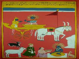 | Description / विवरण | Miniature painting based on Shri Bhagwat Gita. It depicts Krishna preaching Arjun about Gita and tells him that he is behind operation of whole universe. |