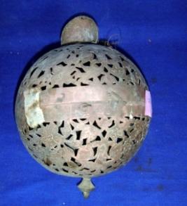 | Description / विवरण | Round copper hanging lamp tee light of Persian style having a hooked top, jali work of floral and bird motifs all over and a tip at the bottom. |