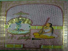 | Description / विवरण | Miniature painting depicting Krishna on his throne and worshipped by a lady who is playing Veena most probably Meera Bai . |