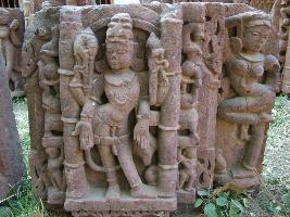 | Description / विवरण | It is a sculpture of four armed Vishnu, with conch, mace, lotus in varada posture, flanked by female dancer and bharvahaka, in pratyalidh posture. |