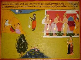 | Description / विवरण | Miniature painting based on Prithviraj Raso depicting Chandvardai talking about the peak of Sumer mountain. One man is depicted playing drama in front of a sage while Kankana come to meet Prithviraj in the left corner. |