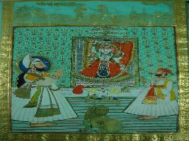| Description / विवरण | Miniature painting depicting a goddess standing on throne and a king is standing and paying homage to the goddess. |