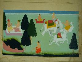 | Description / विवरण | Miniature painting depicting procession of gods in which Shiv is riding on his vahan-Nandi, Indra on Airavat and Brahma on Swan. It is an incomplete paining. |