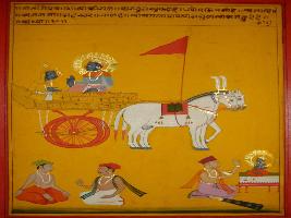 | Description / विवरण | Miniature painting based on Shri Bhagwat Gita. It depicts Krishna preaching Arjun that the intellectuals who know that Krishna is originless and Maheshwar then they get rid of sin on the earth only. |