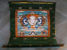| Description / विवरण | It s a Thankha Painting in cloth. Four armed god is painted in multicolour in center. It is painted on Bhutan Silk and yellow ochre and green silk mount. Its background is painted with flower s and leaves and wavy shape clouds and water. |