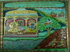 | Description / विवरण | Miniature painting depicting Krishna and Radha in sitting position in the palatial balcony while Kamdev two gopis and two Gandharvas also depicts in the painting. |