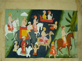 | Description / विवरण | Miniature painting depicting procession of a king. The king is sitting on elephant and beside him there are horse men, a camel rider in the procession two men are shown in Vayuyaan. They are all shown crossing the river. It is an incomplete painting. |