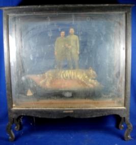 | Description / विवरण | Tiger hunting scene carved on wooden block, depicting Maharaja Bharatpur during the period of 1625. They are standing upon the tiger. It is kept in a glass box with stand. |