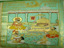 | Description / विवरण | Miniature painting depicting Bhim Singh worshipping Shiv linga where Kutub Singh is seen in sitting position and two priests also depicting in the painting. |