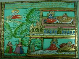 | Description / विवरण | Miniature painting depicting Krishna and Radha in loving union posture while two gopis and Shiv is also seen in the painting. |
