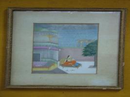 | Description / विवरण | It s a miniature painting of Nayika sitting at octagonal shaped base in painting. A tree can be seen in front side and at back side architecture is painted. Background has light green, blue colour and brown colour wall painted. It s a painting with wooden frame. |