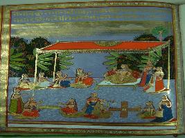 | Description / विवरण | Miniature painting depicting Radhika sitting on a throne and talking with other gopis while some other gopis are also seen that playing chaupar. |