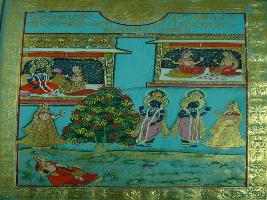 | Description / विवरण | Miniature painting depicting Krishna and Radha are Krishna is talking about Radha with a gopi while Radha is seen in the other part. On the other hand Radha is seen lying in garden and waiting for Krishna. |