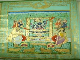 | Description / विवरण | Miniature painting depicting Shri Nath ji worshipped a king of Mewar and a priest are seen in left side. In the lower part four bull are seen. |