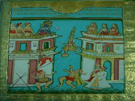 | Description / विवरण | Miniature painting depicting Krishna followed by three attendants and Radha also seen backed by two female attendants in their palatial balcony while two girls are performing circus by climbing on a string. |