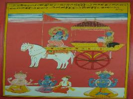 | Description / विवरण | Miniature painting based on Shri Bhagwat Gita. It depicts Krishna preaching Arjun that satvik, Rajas and Tomas all are from him and they are incised with in him. |