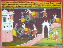 | Description / विवरण | Miniature painting based on Krishna charit depicting arrival of Krishna and Balram with an elephant sent by Kansa. Kansa watching the fight from his palatial balcony. |