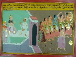 | Description / विवरण | Miniature painting based on Mahabharat - Sabha parva depicting Dhritrashtra is asking Vidur how the Pandavas are going to the forest then Vidur replied that Yudhisthir left by covering his face while Bhim left by raising his both hands. then Arjun left by throwing arrows and Draupadi too covered her face with her hair and scarf and Dhaumya sage left by holding a kush in his hand. |