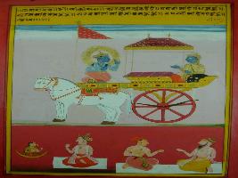 | Description / विवरण | Miniature painting based on Shri Bhagwat Gita. It depicts Krishna preaching Arjun his importance. He says that he is in earth, he is the glow of sun, he is the life of living beings, and he is penance of sages. |