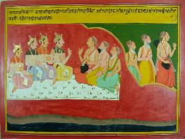 | Description / विवरण | Miniature painting based on Mahabharat - Sabha parva depicting Narad and other sages came to Dhritrashtra and ask him about conflict. Then Dhritrashtra tells about 13 years exile of Pandavas. |