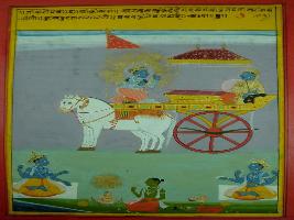 | Description / विवरण | Miniature painting based on Shri Bhagwat Gita. It depicts Krishna preaching Arjun about emergence and dissolution of whole universe. |