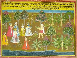 | Description / विवरण | Miniature painting based on Krishna charit depicting the scene Vasudev Krishna visit to the palatial garden of the Kansa at Mathura. A person who s name is sideman welcoming Vasudev Krishna in garden. It is an incomplete painting. |
