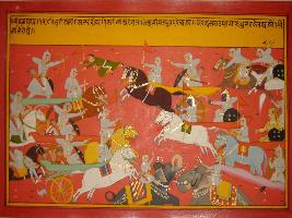 | Description / विवरण | Miniature painting based on Mahabharat - Bhishma parva depicting Bhurishrava and Shalya are fighting with Arjun. Then, Brishketu come forward to help Arjun. |