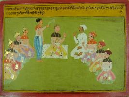 | Description / विवरण | Miniature painting based on Mahabharat - Sabha parva depicting ministers and Dhritrashtra are talking about the fall of meteorite and whole place caught on fire. Duryodhan says to king that whole of the state is on fire and kauravas are also disturbed. |
