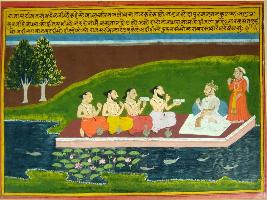 | Description / विवरण | Miniature painting based on Krishna avatar charit depicting Vasudev ji talking with four sages on very important matter, and one chauri-bearer depicts in standing position behind the Vasudev ji. It is an incomplete painting. |