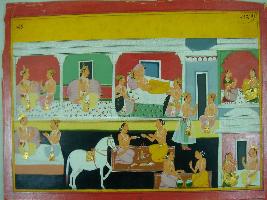 | Description / विवरण | Miniature painting based on Mahabharat - Sabha parva depicting a king talking to a man and sleeping on upper part and on the lower part Brahmans are depicted performing Ashwamegh yagna. |