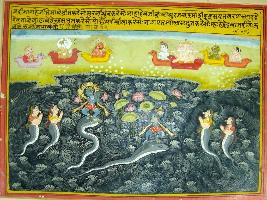 | Description / विवरण | Miniature painting based on Krishna charit depicting the story of Kaliya demon. Krishna defeats Kaliya nag. In the upper part all the gods are showering flowers on the victorious Krishna. |