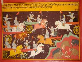 | Description / विवरण | Miniature painting based on Mahabharat - Bhishma parva depicting war scene between Kaurvas and Pandavas. Abhimanyu is fighting with five warriors-Aswathama, Bhurisrava, Shalya, Chitrasen and son of Sanjamat. And Abhimanyu is compared with lion who is fighting with five elephants. In the archery and bravery, nobody can compete Abhimanyu. |