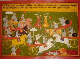 | Description / विवरण | Miniature painting based on Mahabharat - Bhishma parva depicting Bhishma, Drona, Shalya, Vivasati, Somdutt etc. of Kaurava army are coming towards Pandava s army. Abhimanyu and Arjun are shown fighting with them. Bhishma first fights with Abhimanyu and then with Arjun. |
