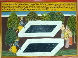 | Description / विवरण | Miniature painting based on Krishna charit depicting the story when Krishna meet Radha and other Gopis at Jar Kunda in garden. It is an incomplete painting. |