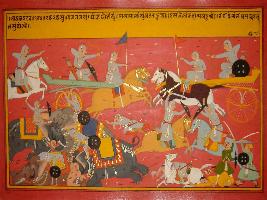 | Description / विवरण | Miniature painting based on Mahabharat - Bhishma parva. It is depict chariots are fighting with chariots, elephants are fighting with elephants, cavalry soldiers are fighting with cavalry soldiers and infantry are fighting with infantry. In this way the day was over and then Bhishma talks to Arjun. |