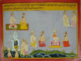 | Description / विवरण | Miniature painting based on Mahabharat - Vana parva. Lomash rishi is depicted with Yudhisthir and telling him that like the demons Duryodhan will also one day destroy and ask him to bath in a river which will give him wealth. |