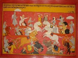 | Description / विवरण | Miniature painting based on Mahabharat - Bhishma parva depicting coming of the army of the Pandavas. By seeing the strategy of Pandavas army everyone is surprised. It also depicts many people are playing various musical instruments. |