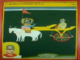 | Description / विवरण | Miniature painting based on Shri Bhagwat Gita. It depicts Krishna preaching Arjun about methods of Yoga sadhana and penance. |